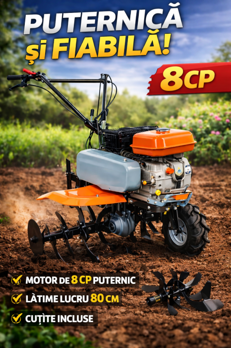 Motorul puternic de 8CP si capacitatea de 212cc confera motosapei forta necesara pentru a lucra in soluri diverse si pentru a efectua operatiuni de prelucrare profunda. Latimea de lucru de 80cm permite acoperirea rapida a terenului, fiind potrivita pentru diverse aplicatii agricole sau de gradinarit.
