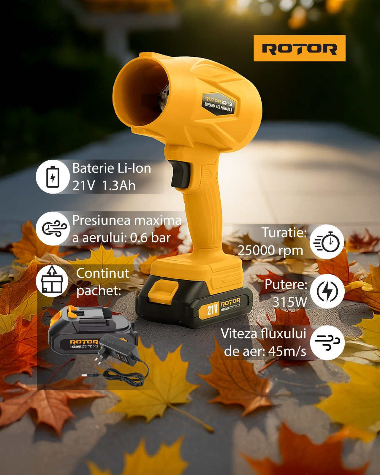 Suflanta RCB-1.5A ROTOR este un echipament compact și eficient, proiectat pentru curățarea rapidă a suprafețelor și spațiilor greu accesibile, fără a fi nevoie de alimentare la rețea. Funcționează pe acumulator 21V/1,3Ah, oferind o mobilitate excelentă și independență totală față de cabluri.