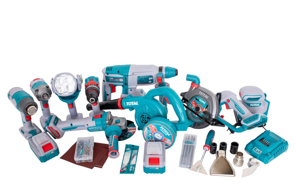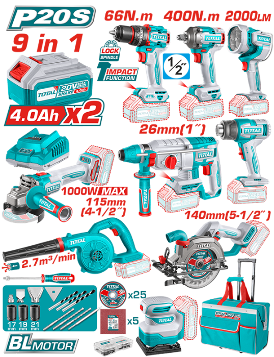 Kitul Combo TOTAL 20V reuneste 9 unelte esentiale pe acumulator, echipate cu motoare Brushless pentru utilizare eficienta si durata de viata extinsa. Pachetul acopera o gama larga de aplicatii precum gaurire, insurubare, polizare, percutie, taiere, slefuire, suflare, incalzire si iluminare. Cele doua baterii de 4.0Ah si incarcatorul inclus asigura mobilitate si autonomie ridicata.