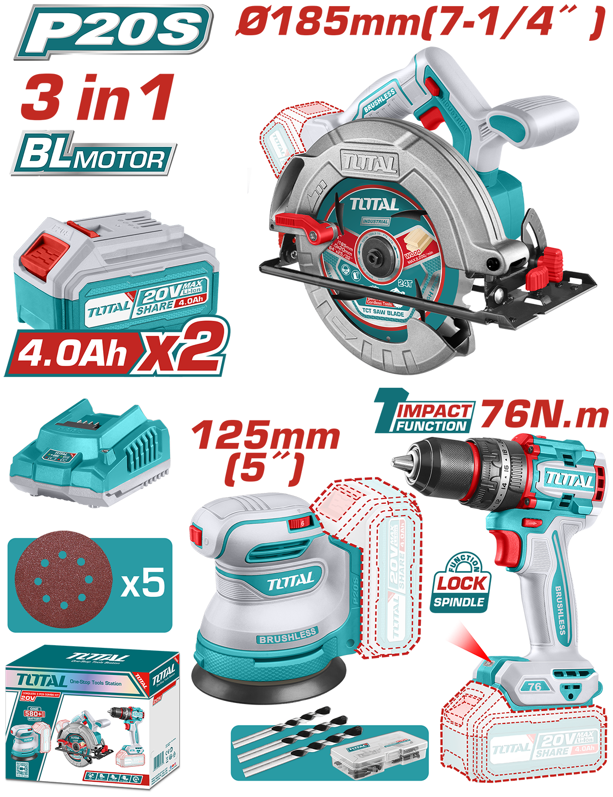 Kitul Combo TOTAL 20V ofera trei unelte esentiale pe acumulator: fierastrau circular, slefuitor si masina de gaurit/insurubat cu percutie. Toate sunt echipate cu motoare Brushless, care asigura functionare stabila, consum optim de energie si durabilitate crescuta. Pachetul include doua baterii de 4.0Ah si un incarcator, permitand utilizarea continua a uneltelor in diverse aplicatii de constructii si renovari.