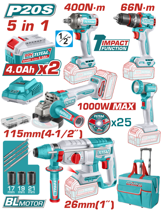 Acest set industrial TOTAL de 20V reuneste cinci unelte esentiale pentru lucrari de constructii, montaj si intretinere. Toate uneltele includ motoare fara perii (brushless), oferind eficienta mai buna, consum redus de energie si durabilitate crescuta. Pachetul este completat cu doua baterii de 4.0Ah, un incarcator si o selectie extinsa de accesorii, astfel incat poate fi folosit imediat.