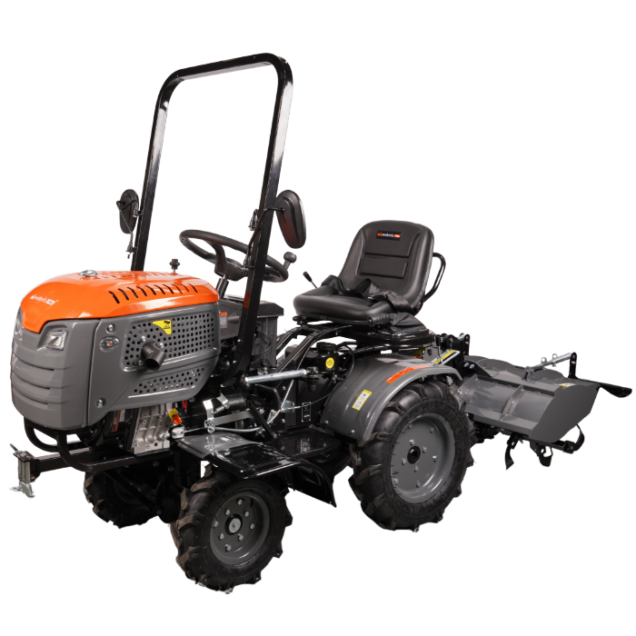 Pentru siguranță și confort, minitractorul este dotat cu scaun reglabil, centură de siguranță, cadru ROPS, oglinzi retrovizoare, sistem de frânare eficient și avertizare acustică.