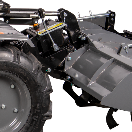 Construcția solidă, cu greutate de 384 kg, asigură stabilitate și durabilitate, iar transmisia cu 4 viteze înainte + 1 viteză înapoi permite adaptarea rapidă la diferite tipuri de lucrări.